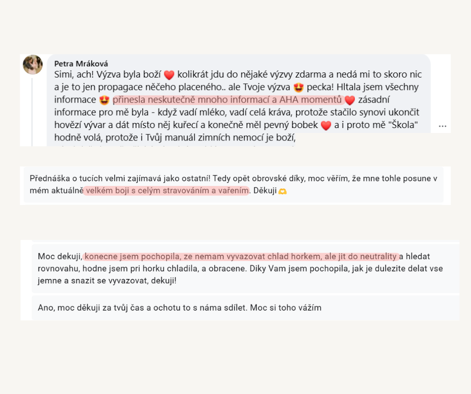 „❤️ Tak strašně moc přínosné informace jen tak někde na jednom místě člověk nenajde, navíc krásně lidsky a polopatě podané. A ještě k tomu skvělé materiály, všechny mám vytištěné a hodlám s nimi aktivně pracovat v kuchyni😊. Byla jsem jednou z těch, které očekávaly recepty, ale jak jsi říkala v jednom z povídání, recepty netřeba, tohle všechno, cos nám předala, je o tolik lepší a užitečnější. Jsi skvělá a moc si vážím toho, co nám dáváš a nejen nám, ale skrze nám také našim dětem 👏“